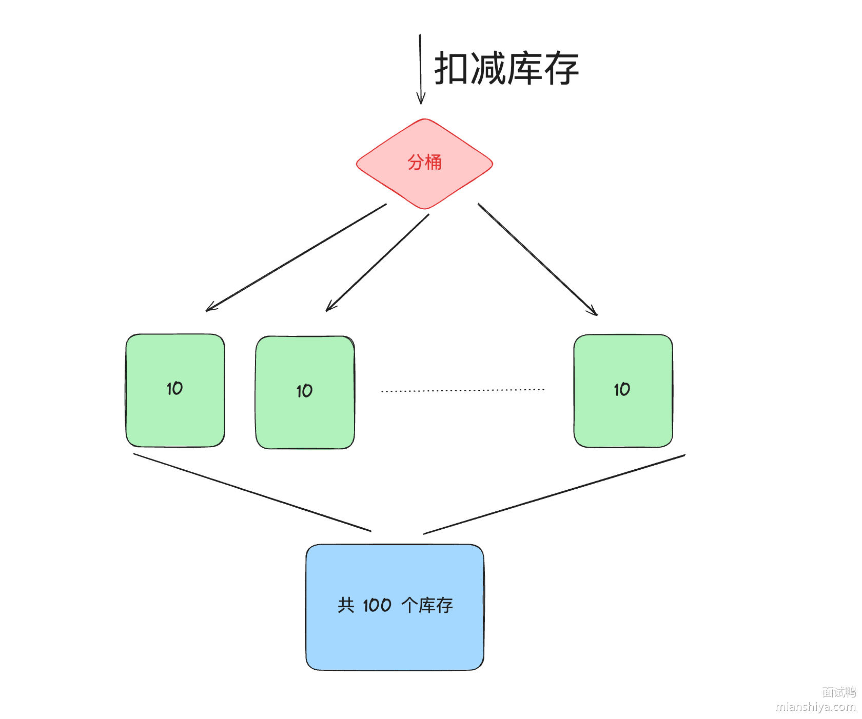 上面举例是 1 个库存,但有时候的秒杀的库存会更多,例如 1000 个库存,此时就可以将这 1000 个库存拆分成 100 个小库存,每个小库存内有 10 个库存。