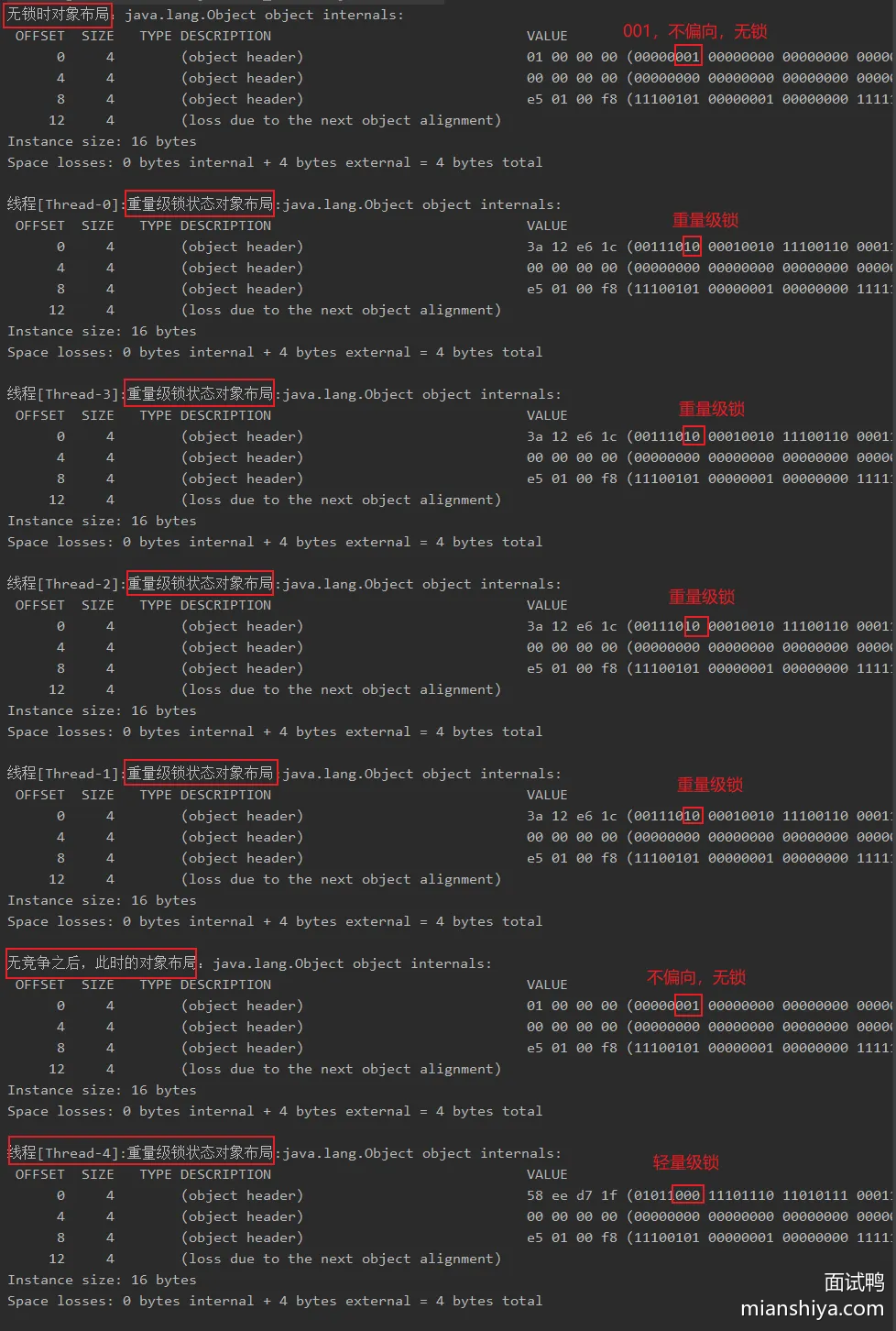 public static void main(String[] args) throws InterruptedException { yesLock = new Object(); System.out.println("无锁时对象布局:" + ClassLayout.parseInstance(yesLock).toPrintable()); IntStream.rangeClosed(1,4).forEach(i->{getYesLock();}); Thread.sleep(5000L); System.out.println("无竞争之后,此时的对象布局:" + ClassLayout.parseInstance(yesLock).toPrintable()); getYesLock(); }